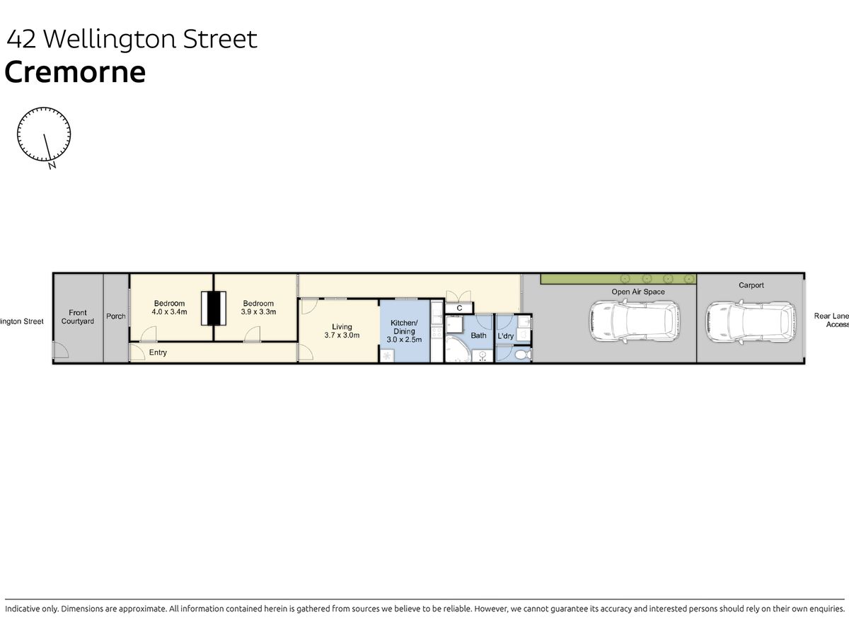 A cute single level Victorian home in excellent sought after location on a large flat block, close to Richmond train, shops, extensive parklands, Yarra river, the iconic MCG, and national tennis centre. A feature of these gorgeous Victorian homes are the 11 foot ceilings approx and huge ornate skirting, while offering 2 bedrooms, new timber floor in the kitchen meals, reverse cycle airconditioner in the living, and a full bathroom with separate toilet off the separate laundry. With rear lane access to your secure carport, there is room for a second car in the generous rear courtyard, sets this home apart from most. The perfect convenient location to life style living, with quick access to the city makes this home an excellent starter.